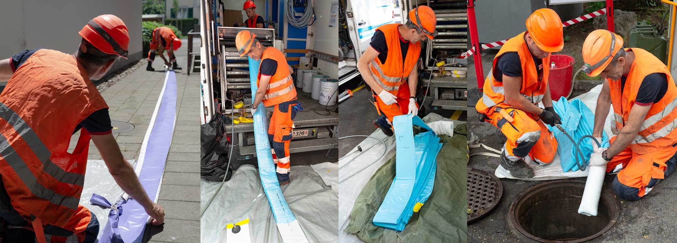 Die Kurzlinersanierung ist ein Reparaturverfahren bei dem ein in Harz getränkter, vorkonfektionierter Glasfaserliner in ein Rohr geschoben wird und mittels UV-Lichtzündung innert 12 Minuten aushärtet.